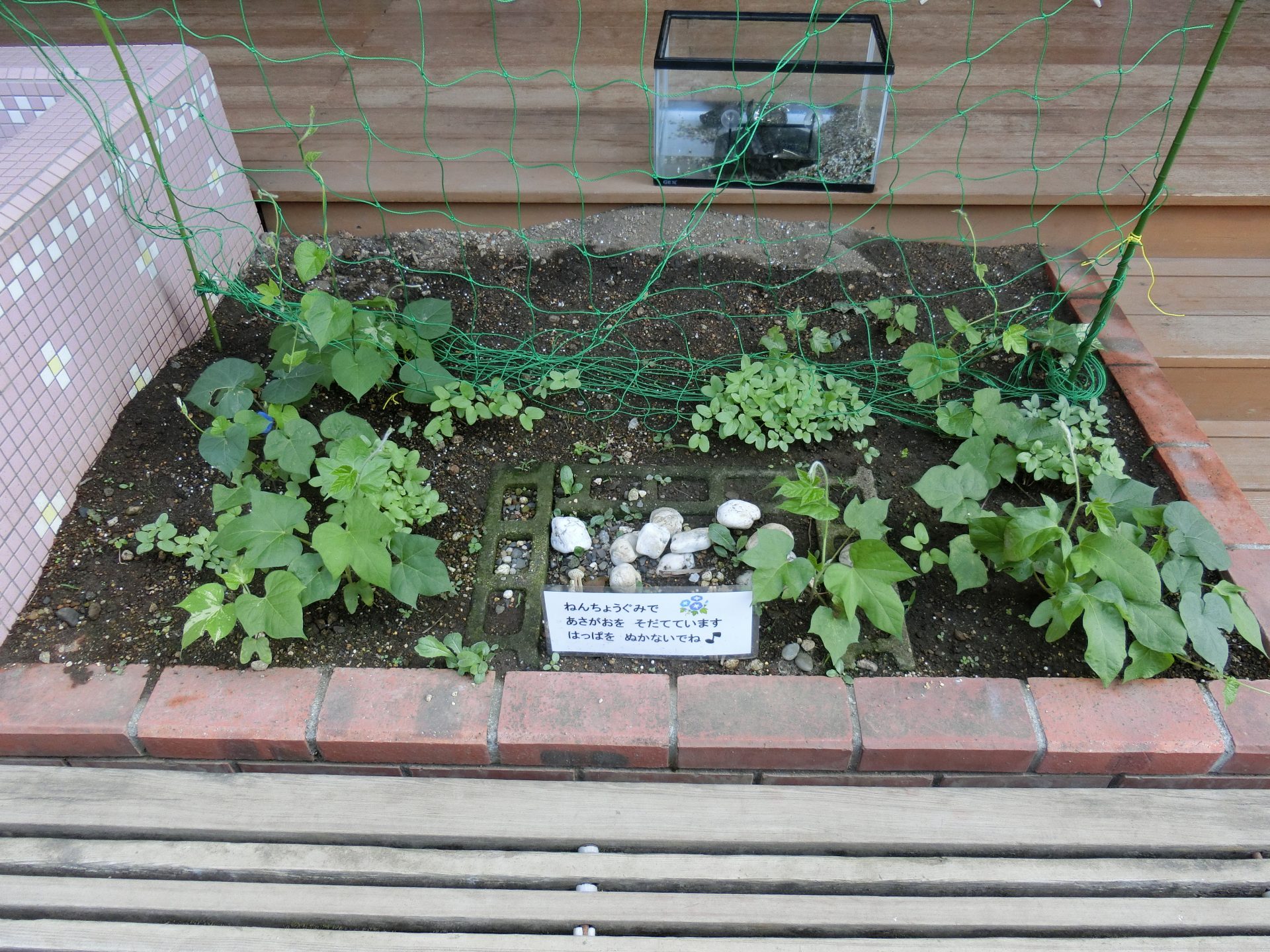 年長組が植えた朝顔が芽を出して、少しずつ大きくなってきました。