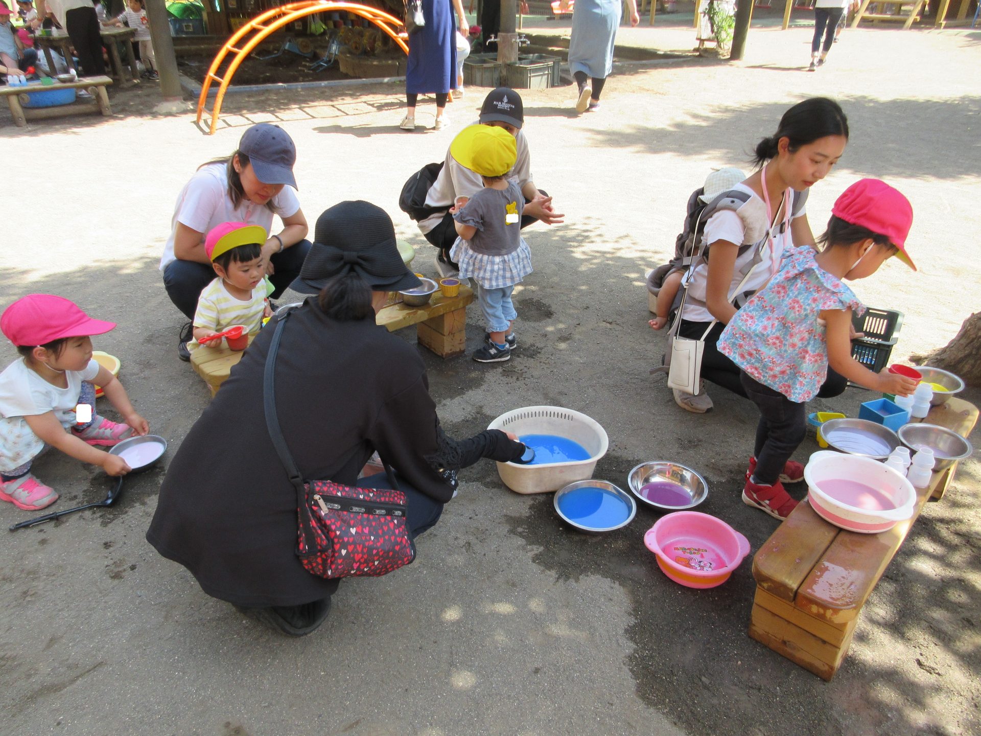 気温が上がり、夏のような日差しの中、色水遊びをしました。