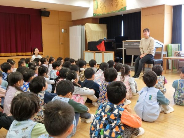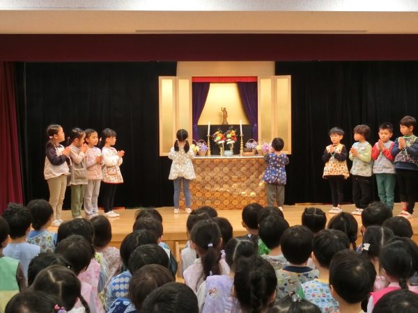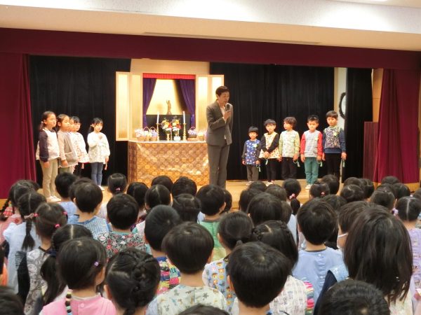 年長組のおつとめ当番が立派におつとめを行う姿に、小さいクラスもしっかりと手を合わせ、おつとめをすることができました。幼稚園の子どもたち皆が立派におつとめをしている姿をお釈迦様は舞台の上から見ていて、いつも見守ってくださっています。