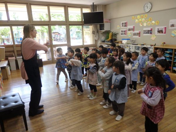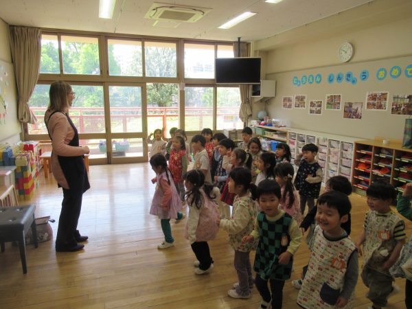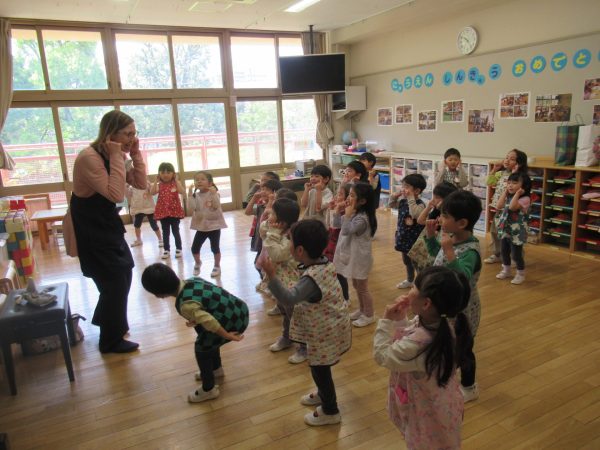 始めと終わりの新しい英語の歌にも興味をもち、一緒に歌ったり、踊ったりして、さっそく楽しんでいました。